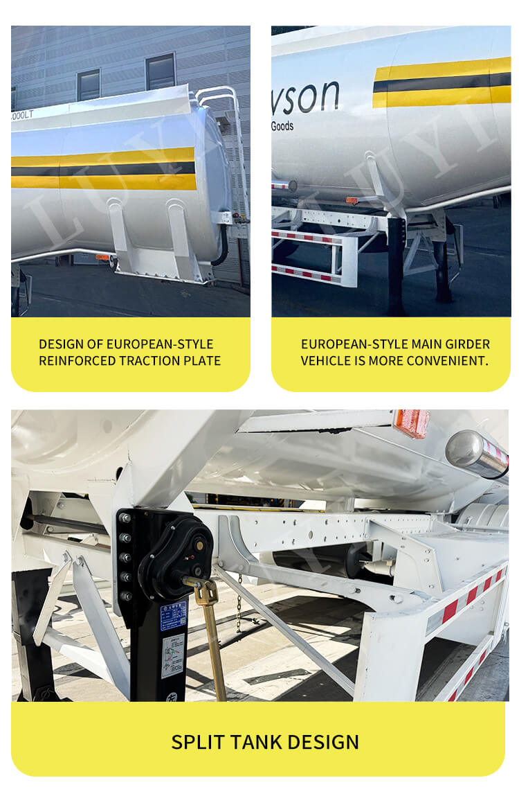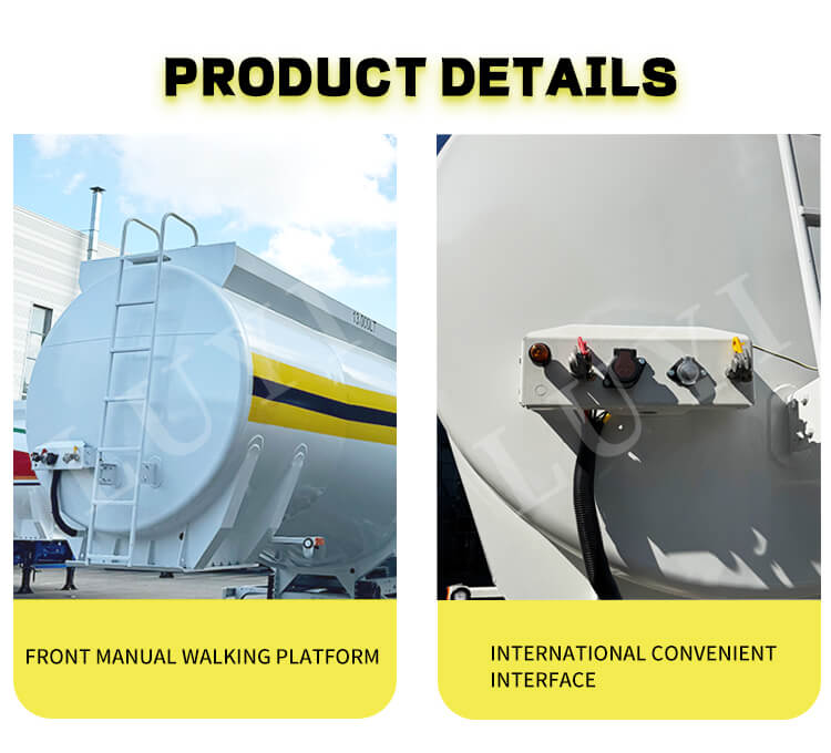 트레일러는 견고하고 안정적인 구성을 자랑합니다. Fuwa, BPW 또는 BERKLEY와 같은 브랜드의 13/16톤 차축이 장착되어 있으며 기계식 또는 에어 서스펜션을 옵션으로 제공합니다. 11.00r20, 12r22.5, 315, 385 등 다양한 타이어 규격과 호환되어 안정적인 주행과 다양한 도로 상황에 대한 적응성을 보장합니다. 편리하고 안전한 작동을 위해 표준 28톤 랜딩 기어와 50#/90# 킹 핀이 함께 제공됩니다. 맞춤형 차체 색상을 지원하는 이 제품은 실용성과 개인화를 결합하여 디젤 운송을 위한 안정적이고 유연한 전문 솔루션을 제공합니다.