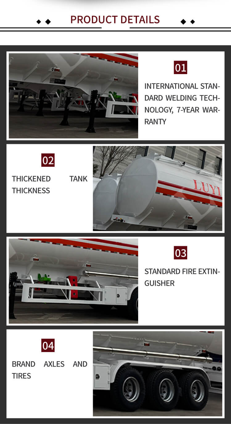 12,500×2,500×3,600mm 크기의 트레일러는 알루미늄 합금, 탄소강, 스테인리스강 등 고품질 강철로 제작되었으며 견고한 구조와 최대 유효 탑재량 60톤으로 강력한 내하중을 자랑합니다. 유명 브랜드 Fuhua/BPW의 3개 차축이 기계식 또는 에어 서스펜션 시스템과 짝을 이루고 90×13×10mm 판 스프링으로 보완되어 뛰어난 주행 안정성을 보장합니다. 세부 구성은 포괄적이고 신뢰할 수 있습니다. 주차 안전을 위한 JOST 표준 28톤 지지대가 함께 제공되고 12R22.5와 같은 다양한 타이어 사양과 호환되어 도로 적응성을 향상시키며 차체 색상은 요청에 따라 맞춤 설정할 수 있습니다. 핵심 성능과 개인별 요구 사항을 모두 충족하는 이 제품은 액체 운송에 대한 전문적인 표준을 완벽하게 충족하며 신뢰할 수 있는 운송 장비입니다.