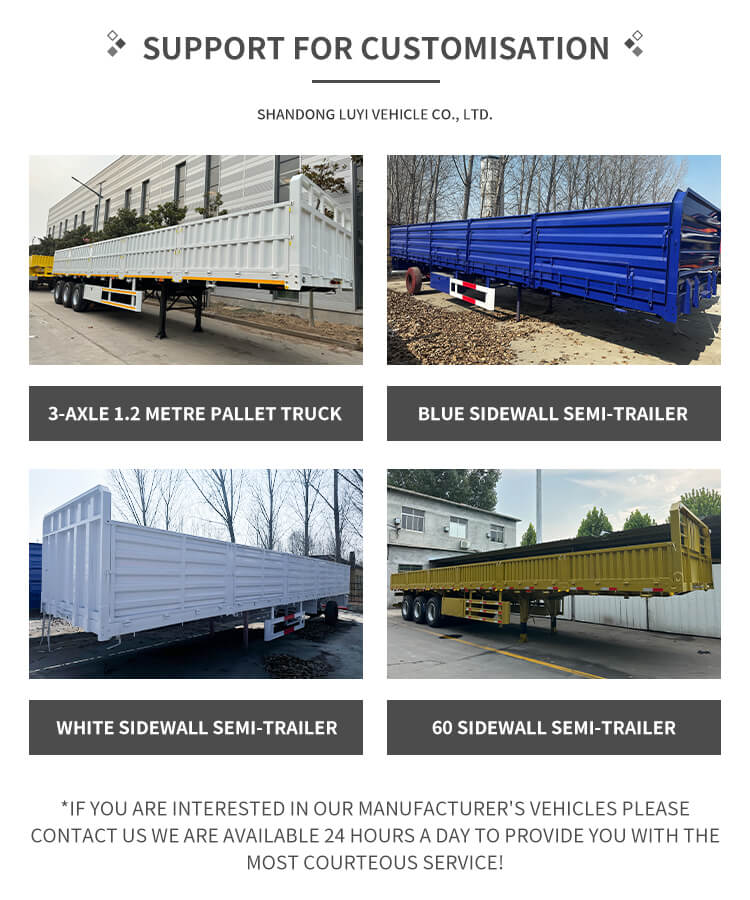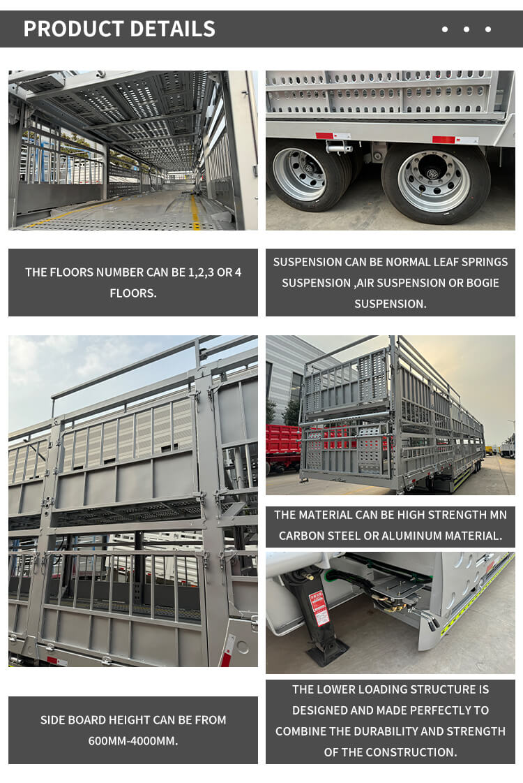 알루미늄/합금 소재로 제작된 트레일러는 가벼우면서도 내구성이 뛰어나며, 최대 유효 탑재량은 30,000kg 이상이므로 고하중 요구 사항을 쉽게 충족할 수 있습니다. 차축의 경우 13/16톤 FUWA, BPW 및 CIMC와 같은 고품질 브랜드를 선택할 수 있습니다. 11.00r20, 12r22.5, 315, 385 등 다양한 사양의 타이어와 매칭되며, 서스펜션 시스템은 기계식 서스펜션과 에어 서스펜션의 두 가지 옵션을 제공하여 다양한 도로 조건에서도 안정적인 주행을 보장합니다. 색상은 고객 요구 사항에 따라 맞춤 설정할 수 있으며 1년 애프터 서비스도 제공되어 운송 시나리오와 개인별 요구 사항을 완벽하게 충족하므로 가축 및 대량 화물 운송에 이상적인 선택입니다.
