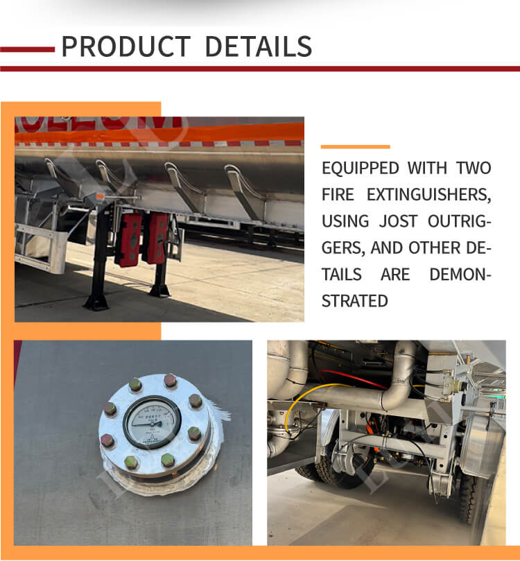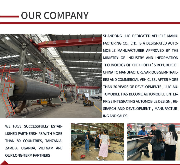 이 세미트레일러에는 LUYI 4개의 차축이 장착되어 있으며 서스펜션 시스템은 기계식 서스펜션 또는 에어 서스펜션 옵션을 제공합니다. 12R22.5 타이어와 매칭되어 안정적이고 안정적인 주행을 보장합니다. 지지다리는 28톤급 표준이며, 킹핀은 2인치(50mm) 또는 3.5인치(90mm)로 제공되어 강력한 적응성을 제공합니다. 실용성과 개인화를 결합하여 고객 요구 사항에 따라 색상을 맞춤 설정할 수 있으므로 연료 운송 분야에서 이상적인 선택이 됩니다.