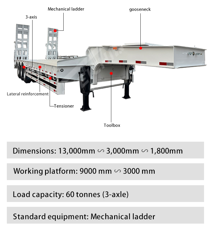 중국 산동에서 생산된 LUYI 3축 60톤 로우베드 세미트레일러는 중장비 운송을 위한 신뢰할 수 있는 선택입니다! 고강도 탄소강으로 제작된 트레일러는 견고하고 내구성이 뛰어나며 최대 적재량은 60톤으로 뛰어난 내하중 용량을 자랑합니다. 엔지니어링 기계, 중장비 등 대형 화물의 장거리 운송에 매우 적합합니다.