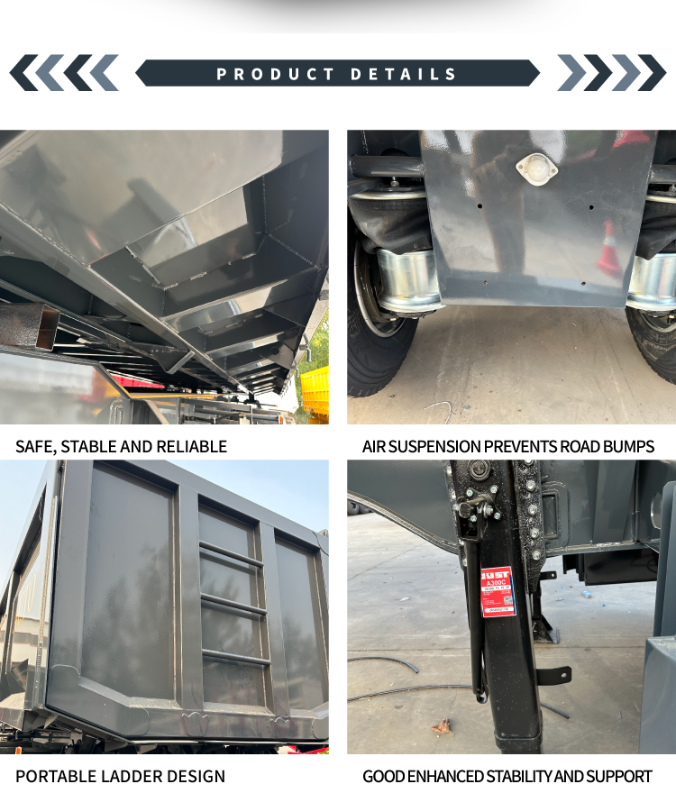 유압식 리프팅 시스템을 사용하여 화물 상자를 하역 시 45~60° 후방 기울일 수 있습니다. 테일 오프닝 디자인은 짧은 하역 시간으로 작업을 간단하고 효율적으로 만듭니다. 에어 브레이크, 기계식/판 스프링 서스펜션 및 표준 견인 핀이 장착되어 있어 대부분의 대형 트랙터와 호환되며 유지 관리 비용이 저렴합니다. 검정색 코팅은 먼지에 강하고 유지 관리가 쉽습니다. 석탄, 광석, 자갈 등 자재의 단거리 운송이든, 규정을 준수하는 장거리 도로 운송이든, 신뢰할 수 있고 효율적인 운송 파트너입니다.