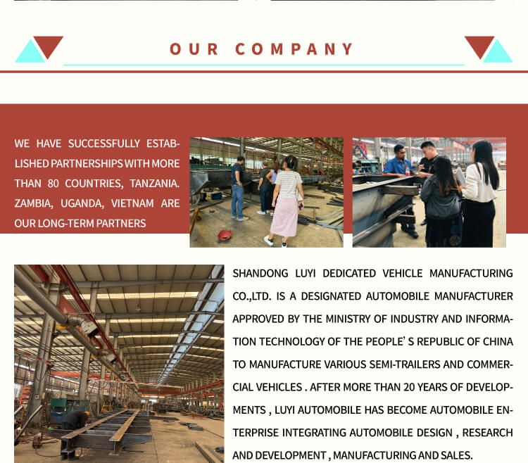 우리 공장은 트랙터뿐만 아니라 덤프 트럭, 스프링클러 트럭, 트럭 크레인, 믹서 트럭, 덤프 트레일러, 탱크 트레일러, 로우 베드 트레일러, 먼지 제거 트레일러 등도 생산합니다. 우리 공장은 규모가 크며 다양한 고객 요구 사항에 따라 다양한 제품을 맞춤 설정할 수 있습니다.