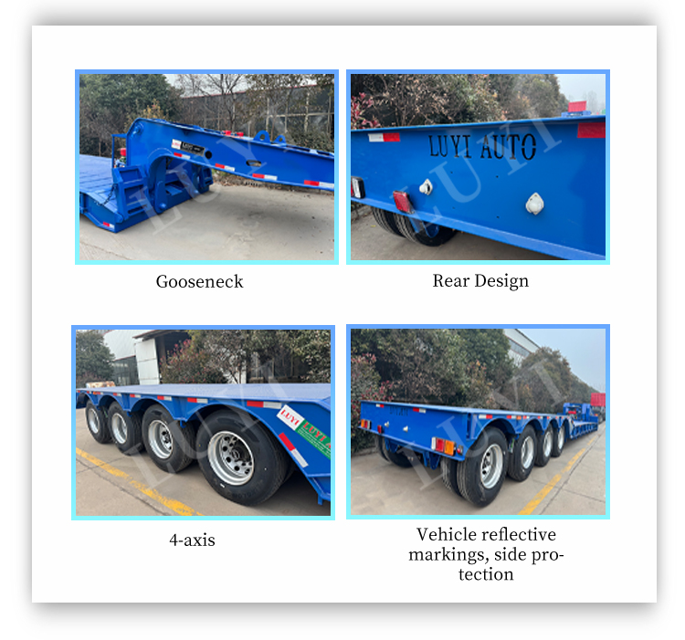 중국 산동에서 시작된 LUYI 4축 구즈넥 로우베드 세미트레일러는 중량물 운송을 위해 특별히 설계된 고품질 세미트레일러입니다. 프리미엄 강철로 제작된 이 제품은 자체 중량이 6,350KG에 불과하고 정격 부하 용량은 50,000KG이며 최대 탑재량은 30T~200T에 이르며 뛰어난 내하중 성능을 제공합니다.