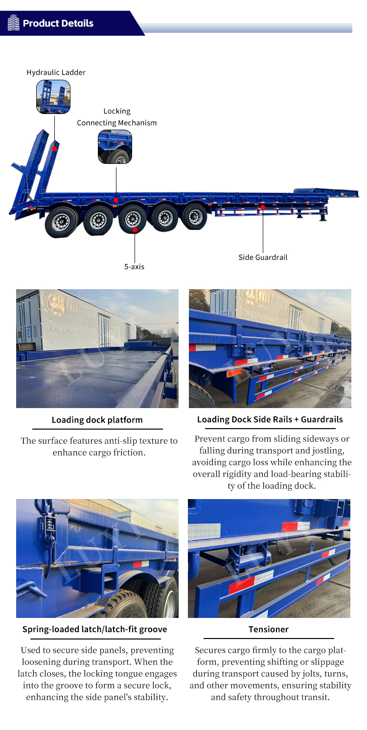 프리미엄 부품을 장착하고 에어 서스펜션 시스템과 결합된 Fuwa/BPW 13톤 차축을 갖추고 있어 뛰어난 주행 안정성과 충격 흡수를 보장합니다. Jost 28톤 2단 랜딩 기어는 효율적인 리프팅 및 하강 작업을 가능하게 합니다. 고객은 다양한 도로 상황에 맞춰 315/80R22.5, 12R22.5, 11.00R20 등의 타이어 옵션 중에서 선택할 수 있습니다. 24V LED 조명 시스템은 낮은 에너지 소비로 밝은 조명을 제공하며, 본체 색상은 개별 요구 사항에 맞게 맞춤 설정할 수 있습니다. Luyi의 신뢰할 수 있는 품질을 뒷받침하는 이 세미트레일러는 글로벌 고객에게 신뢰할 수 있는 중거리 운송 솔루션을 제공합니다.