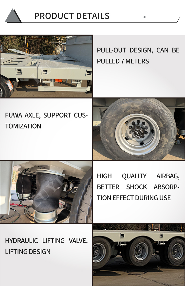메인 빔은 T700/Q345 고강도 강철로 제작되었으며, 8축 구조와 기계식/에어 서스펜션 옵션이 결합되어 안정적인 중량 배분과 향상된 안전성을 보장합니다. 듀얼라인 브레이크 시스템으로 주행 안전성을 보장하며, 28톤 랜딩기어를 기본 탑재해 승하차 편의성을 높였습니다. 다양한 타이어 사양(11.00r20, 12r22.5, 315, 385)과 JOST 표준 직립형(2인치/50mm 또는 3.5인치/90mm)을 갖춘 이 세미 트레일러는 부식 방지 폴리우레탄 페인트를 특징으로 하며 다양한 중부하 운송 요구 사항을 충족할 수 있는 맞춤형 색상을 제공합니다.