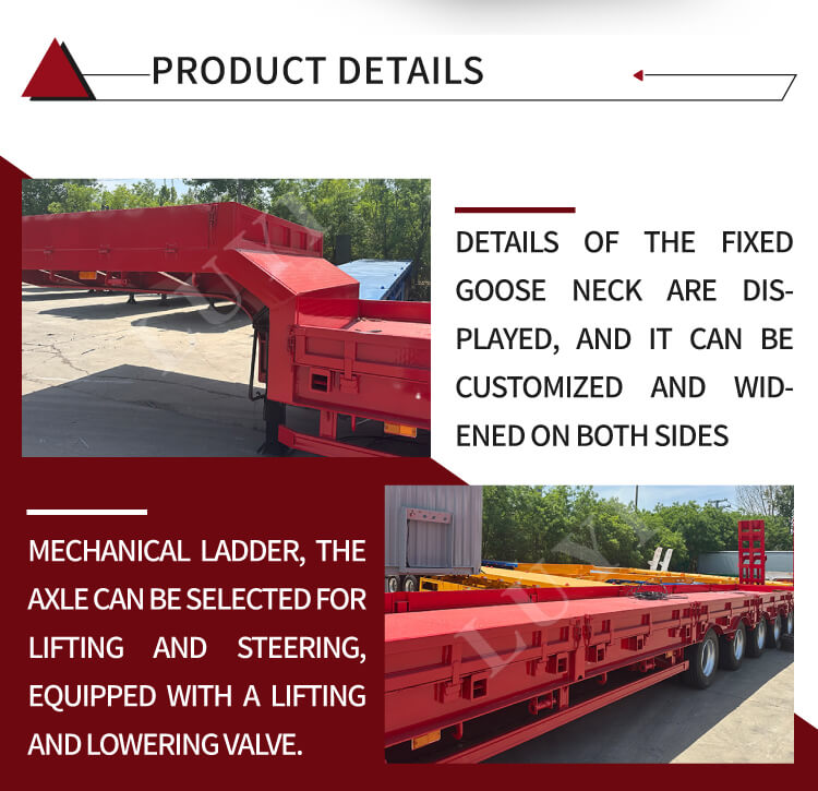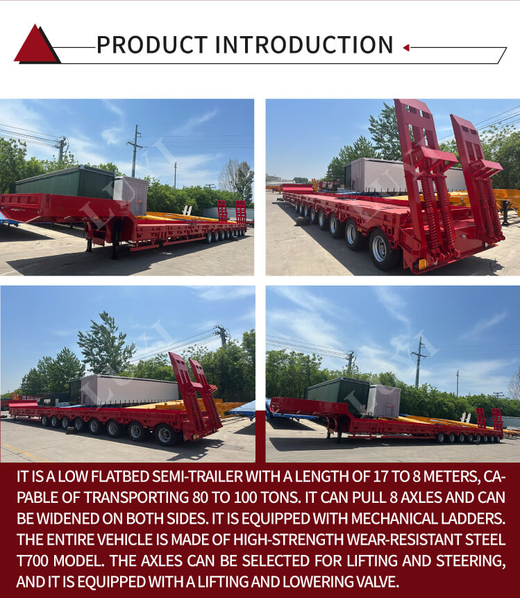 고품질 탄소강 또는 알루미늄으로 제작되어 내구성과 경량 요구 사항의 균형을 이루고 최대 100톤의 탑재량을 자랑하여 다양한 중장비 운송 시나리오를 쉽게 처리할 수 있습니다. 8축 디자인을 갖춘 이 차량은 기계식 서스펜션 또는 에어 서스펜션 시스템과 결합된 Fuwa 또는 BPW 브랜드 액슬 옵션을 제공하여 주행 안정성과 화물 안전을 보장합니다. 다양한 도로 조건에 적합한 12R22.5, 12.00R20, 11R22.5의 세 가지 타이어 사양을 사용할 수 있습니다.