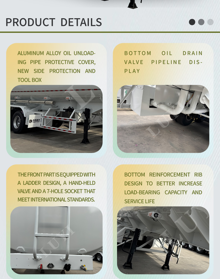 LUYI 브랜드 연료 운송 특수 세미 트레일러는 가볍고 부식 방지 알루미늄 합금 연료 탱크를 완벽하게 갖추고 있으며 트랙터 장치와 함께 사용해야 합니다. 24,000~50,000리터의 넓은 용량 범위를 포괄하는 이 모델에는 3축 표준 버전과 3격실 다중 제품 버전이 포함되며 최대 적재 용량은 32,000kg입니다. 소용량 모델은 단거리 소규모 충전소 공급에 적합하며, 다구획 대용량 모델은 장거리 다품종 운송을 지원해 주유소, 정유소 등의 다양한 연료 분배 요구를 완벽하게 충족합니다.